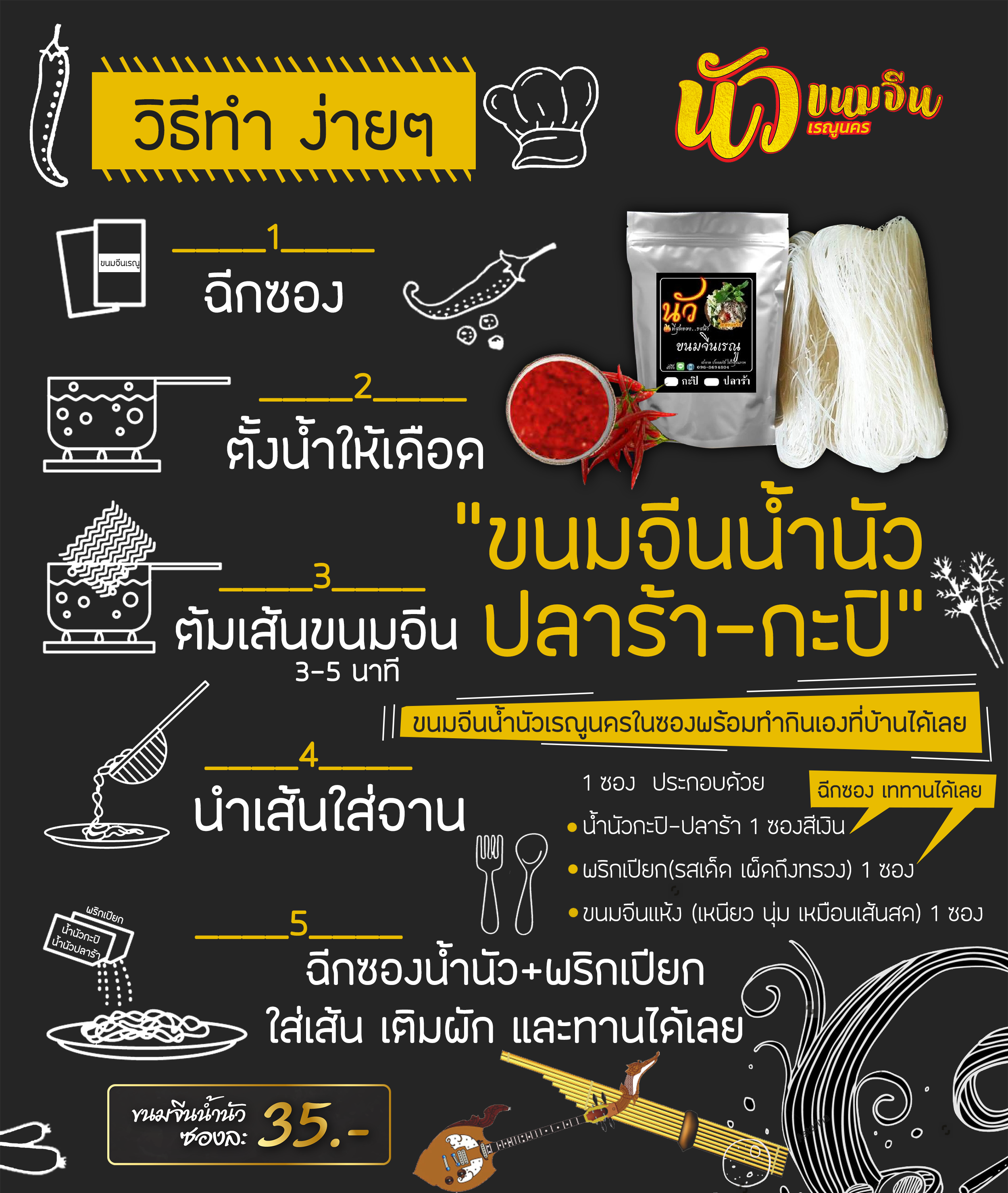 ขนมจีนน้ำนัว ต้นตำรับ ราคาปกติ ห่อละ 35.- มีสองรสชาติ รสกะปิ / รสปลาร้า |