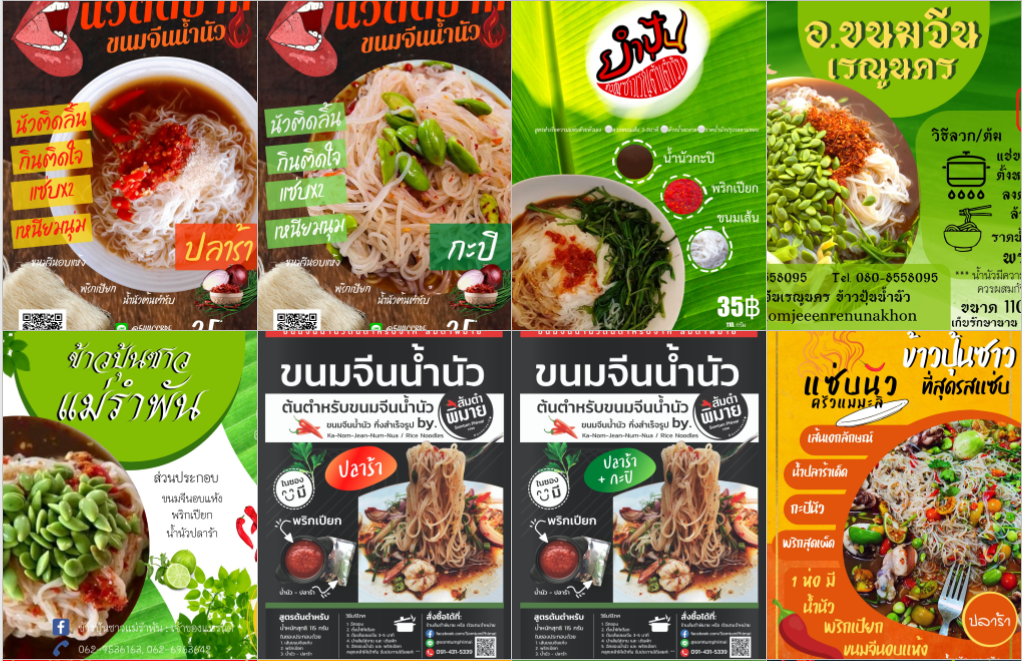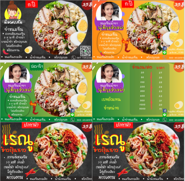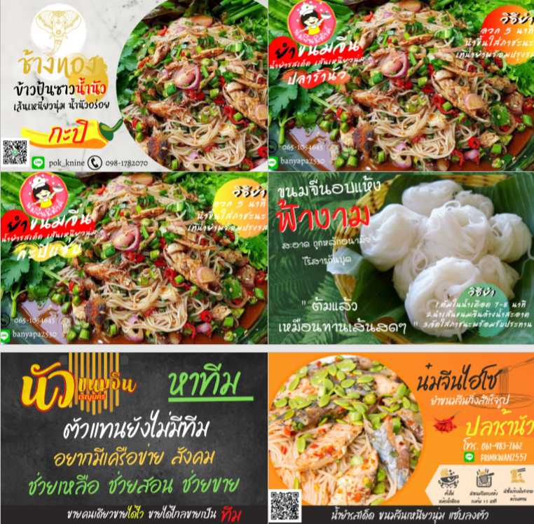 จำหน่ายเส้นขนมจีน ขายพร้อมข้าวแกง น้ำยา น้ำพริก น้ำเงี้ยว ส้มตำ ทอดมัน ห่อหมก เมี่ยงปลาทู ขายยำขนมจีนตามตลาดนัด