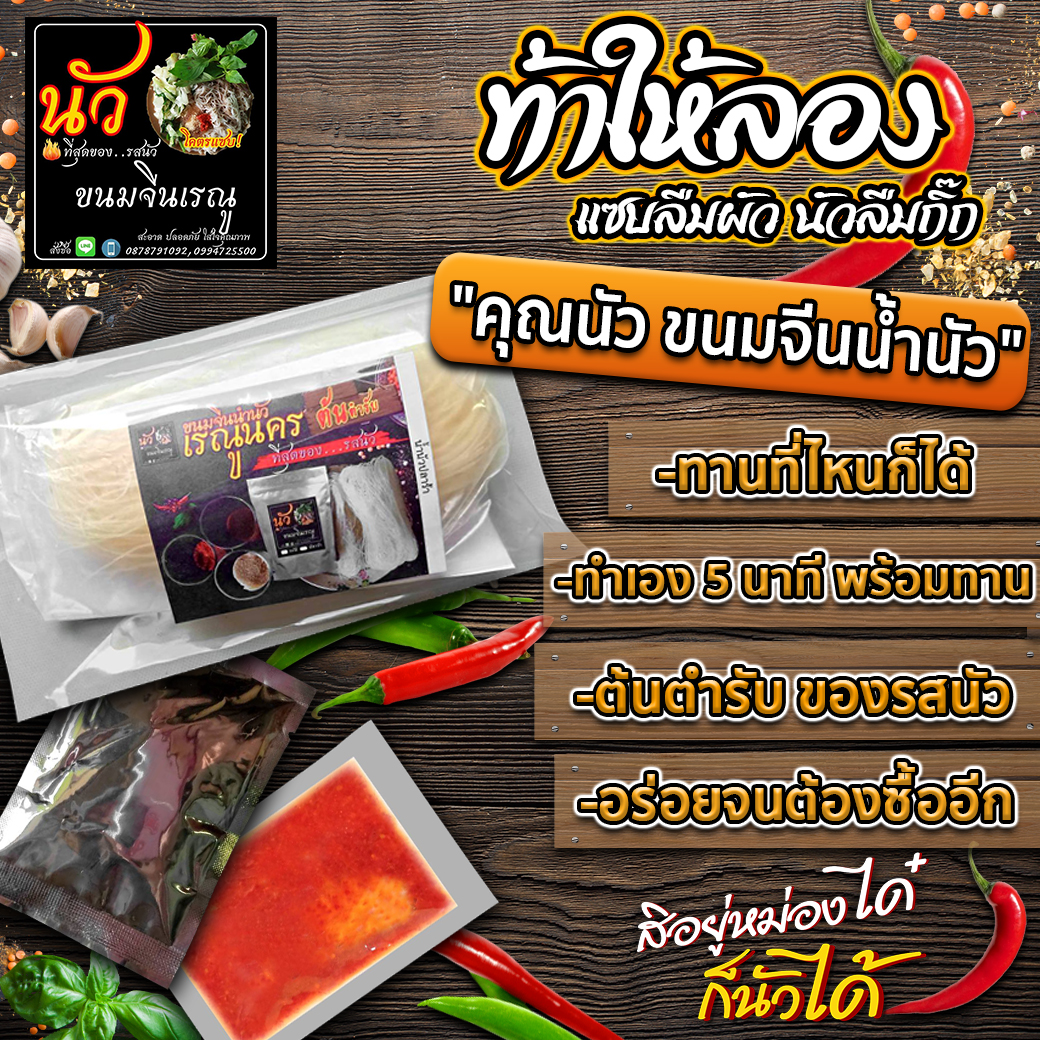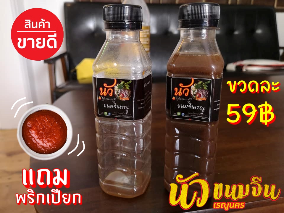 แบบขวด ราคาขวดละ 59.- น้ำหนัก 250 กรัม เก็บไว้ได้ 2 สัปดาห์ " สินค้าถึงมือลูกค้าต้องแช่ตู้เย็นทันที " " มิติใหม่...ยำขนมจีน แบบกึ่งสำเร็จรูป เส้นเหนียว นุ่ม ขาว สะอาด เส้นยาวคุณภาพ " เมื่อลวกแล้วให้ความรู้สึกเหมือนทานเส้นขนมจีนสดๆ นุ่มลื่นคล่องคอ 2. น้ำยำขนมจีน(น้ำนัวขนมจีน สูตรเรณูนคร) แยกเป็นน้ำกะปิ หรือ น้ำปลาร้า 3. พริกเปียกแถมให้ซอง (เป็นเครื่องปรุง รสเด็ด ต้นตำรับรสนัว) น้ำยำขนมจีนน้ำปลาร้า-น้ำกะปิ (ขนมจีนน้ำนัว) แถม... (พริกเปียก) พริกเผ็ดมาก!!! สุดยอดรสอร่อย แซบ โครตนัว! บอกเลยแซ่บบบบบบบบบ!! สูตรคุณนัวเรณูนคร (ขนมจีนเหนียว เส้นยาว ขาวนุ่ม ขาวคุณภาพ) น้ำยำขนมจีน(น้ำนัวขนมจีน) แบบซอง ทานได้ 1 ห่อ ต่อ 1 จาน คัดสรรปลาร้าต้มสุกอย่างดี ผ่านการพลาสเจอไรซ์แน่นอน รสชาติแปลกใหม่ กลมกล่อม หอม นัวๆๆ ปลาร้า กลิ่นไม่แรง กินครั้งแรก บอกเลยว่าติดใจแน่นอน หาทานยาก หาที่ไหนไม่ได้!! คัดสรรกะปิคุณภาพอย่างดี ผ่านการพลาสเจอไรซ์ รสชาติแปลกใหม่ กินครั้งแรก บอกเลยว่าติดใจแน่นอน รสชาติกลมกล่อม หอม นัวๆๆ แนวกะปิ กลิ่นไม่แรง สามารถลวกทานที่ไหนก็ได้ ไม่ว่าจะเป็นที่บ้าน ที่ทำงาน งานต่างๆ · เพียงลงต้นในน้ำเดือดๆ ประมาณ 3-5 นาที · สังเกตเส้นจะขุ่น เส้นจะไม่แข็ง หากยังไม่อ่อนตัวให้ต้มระยะเวลานานมากขึ้น · นำขึ้นล้างในน้ำสะอาด ตักขึ้นพักให้เย็น ใส่เครื่องเคียงลงได้ทุกอย่าง ทั้งผักลวก ผักสด เนื้อต่างๆ